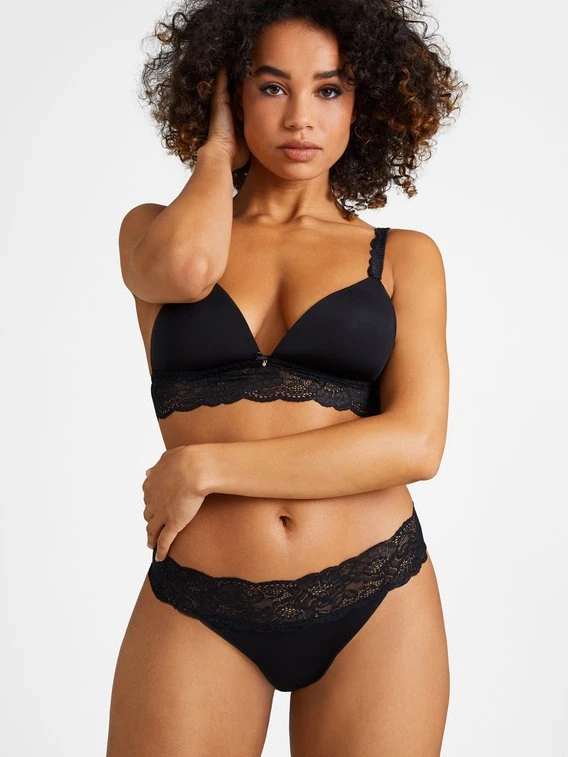 Mit der “Sweetessence” Linie präsentiert das Pariser Dessous-Label AUBADE eine neue Must-Have-Kollektion, die sich durch bequeme, alltagstaugliche Schnitte, feminine Spitzen-Details und recycelte Stoffe auszeichnet. Der Rio-Slip besteht aus weicher Komfort-Wirkware und einem anschmiegsamen, breiten Spitzenbund, um ein angenehmes Tragegefühl zu vermitteln. Die flachen, elastischen Einfassungen des Slips sorgen zudem für einen idealen Sitz.