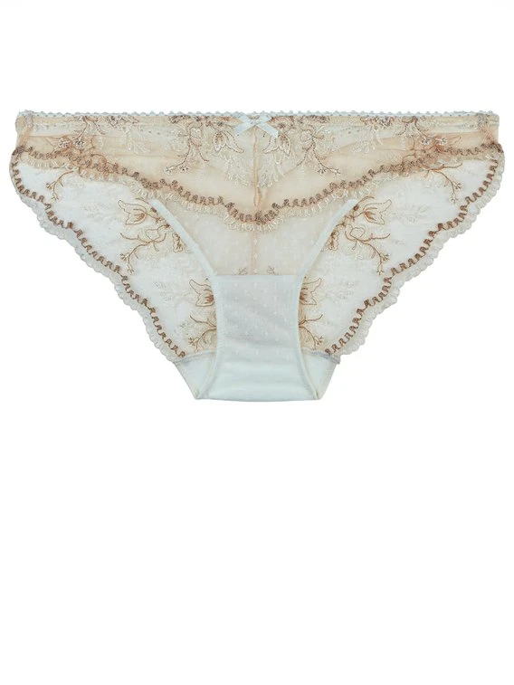 Die Linie “Trésor Infini” von AUBADE ist ein verführerisches Wäsche-Juwel aus Plumetis-Tüll, visueller Stickerei mit feinem Lurex-Garn, Satin-Bändern und Strass-Schmucksteinen. Der Italiener-Slip der Serie kombiniert gekonnt ultrafeinen, transparenten Tüll mit raffinierter Blumenstickerei und semitransparentem Plumetis-Tüll im Schambereich, um einen sinnlichen, eleganten Look kreieren. Die flachen Abschlüsse des Slips schmiegen sich perfekt an die Konturen an und zeichnen sich nicht durch die Oberbekleidung ab. Die sexy Schnürung auf der Rückseite rundet das sinnliche Design des Höschens perfekt ab.