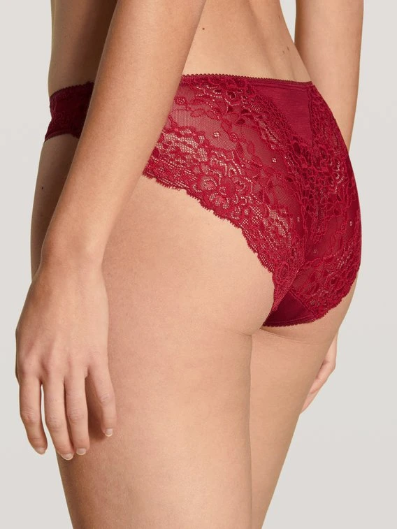 Romantischer Rio-Slip aus der Kollektion SENSUAL SERCRETS von CALIDA. Die schöne Kombination aus Baumwolle und Viskose-Mischung und transparenter, verführerischer Spitze auf der Rückseite macht das Höschen der Serie zu etwas ganz Besonderem. Eine Mäusezahnspitze am Bund betont den Abschluss des Slips.
