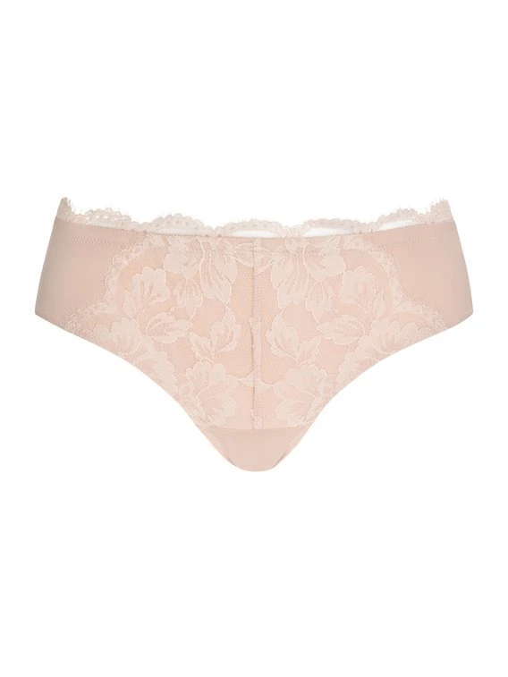 Die Hipster der femininen, spitzenbesetzten Serie „Amazing“ von MEY bietet einen hohen Tragekomfort dank weicher, hautfreundlicher Materialien sowie einen verführerischen Look, der die weiblichen Reize elegant in Szene setzt. Die Brazil-Panty mit knapper Schnittform am Gesäß besteht aus einer glatten, blickdichten Rückseite mit einem transparenten Spitzeneinsatz am Bund und einer aus zarter, floraler Spitze verzierten, blickdichten Vorderseite.
