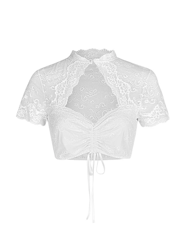 NINA VON C. präsentiert aus der neuen Kollektion eine Dirndlbluse mit halben Ärmeln. Das zarte Material mit floralem Muster aus Modal und Elasthan ist angenehm leicht auf der Haut und lässt sich perfekt unter einem Dirndl tragen. Ein leichter Stehkragen lässt sich mit einem Knopf verschließen. Die gewellten Kanten und der tiefe Ausschnitt mit individuell verstellbarer Raffung machen die Dirndlbluse zum absoluten Blickfang. Die Bluse lässt sich perfekt mit den NINA VON C „Silver Edition“ Dirndl-BHs kombinieren.